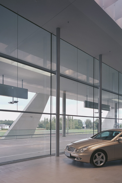 Der Entwurf für das Gebäude stammt von KadaWittfeldArchitektur, dem Aachener Büro, das Klaus Kada, langjähriger Professor an der Technischen Hochschule Aachen, zusammen mit Gerd Wittfeld betreibt. 2001 hatten sie einen Wettbewerb gewonnen, den Pappas für ein anderes Grundstück ausgeschrieben hatte. Zwei Jahre später folgte der Auftrag, für ein leicht reduziertes Raumprogramm auf dem neuen Grundstück ein Projekt zu entwickeln. Dessen Grundidee besteht darin, die Straße aufs Verkaufsniveau hinauf- und rund um das Gebäude herumzuführen. Damit diese Zufahrt nicht zu banal und vor allem - als offener Schauraum - auch von den umgebenden Straßen aus gut einsehbar ist, neigt sie sich in einer leichten Schleuderbewegung nach außen und dann nach unten, bevor sie artig in die Horizontale übergeht. Dass Kada, dessen Affinität zu schnellen Autos legendär ist, Spaß an dieser Idee hatte, darf angenommen werden.