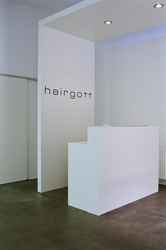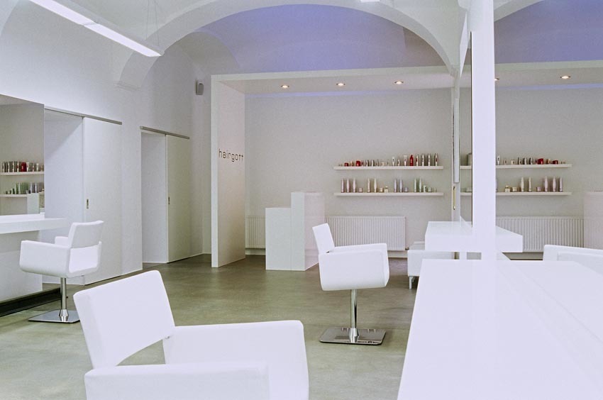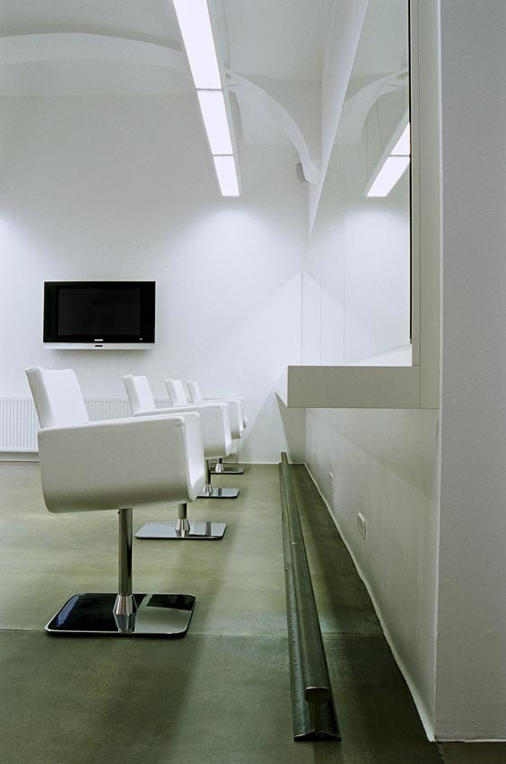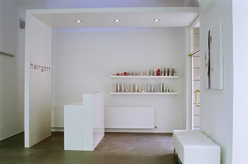 An einem schlichten Verkaufspult, akzentuiert durch ein beleuchtetes Wand- und Deckenelement, wird der Kunde in Empfang genommen und kann sich über den klarstrukturierten und offenen Schneideraum einen Überblick verschaffen. Dieser Bereich führt in den Salon und bietet dem Kunden Schutz. Der Empfangsbereich wird mittels farbigem Licht mit dem Wartebereich abgestimmt und setzt einen Kontrapunkt zum sonst eher steril wirkenden weißen Bereich. An der Längsachse des Raumes sind die Schneideplätze an beiden Seiten angeordnet, ihre großzügigen Spiegel erweitern den Gesamtraum. Das stringente Raumgefüge sowie seine leichte Ablesbarkeit verstärken das Gefühl des Wohlbefindens während eines Friseurbesuches. Der fugenlose Boden ermöglicht einen fließenden Übergang und verbindet die einzelnen Bereiche, die sich nur durch Funktion und Einrichtungsdetails unterscheiden.