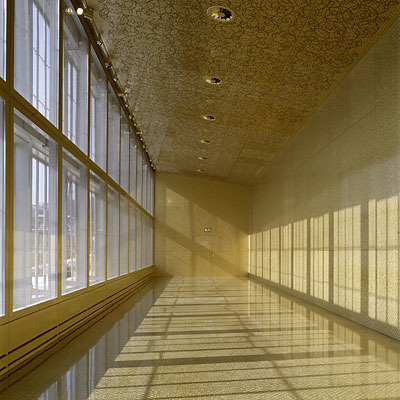 Das in den Jahren 1842/43 errichtete klassizistische Gebäude inmitten des Grazer Burggartens diente ursprünglich der Überwinterung tropischer Pflanzen, wurde aber bereits im 19. Jahrhundert durch temporär aufgestellte Veranstaltungszelte für Feste und Bälle genutzt.Im Zuge einer umfangreichen Renovierung wurde dieses Programm nun zum eigentlichen Zweck des Gebäudes: Splitterwerk verwandelte den zentralen Hauptraum in einen repräsentativen goldenen „Spiegelsaal“. Die digital generierten Ornamente, die die Oberflächen von Boden, Wand und Decke umfassen, wirken dabei in zweierlei Hinsicht performativ, wie Angelika Fitz schreibt. Zum einen lassen sie den Raum wahrnehmungsphysiologisch in ständiger Veränderung durch Überlagerungs-, Kipp- und Schwebeeffekte performativ werden, zum anderen werden sie zu operativen Interfaces durch Zuschalten der gewünschten Raumprogramme, die sich in den angrenzenden Räumlichkeiten bzw. hinter den Oberflächen befinden. Angelika Fitz: „Splitterwerk erfindet statt Oberflächen für Räume, Räume für Oberflächen. Die Architektur ist nicht Träger der raumbildenden Oberfläche, sondern die Architektur ist die Oberfläche.“