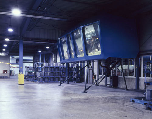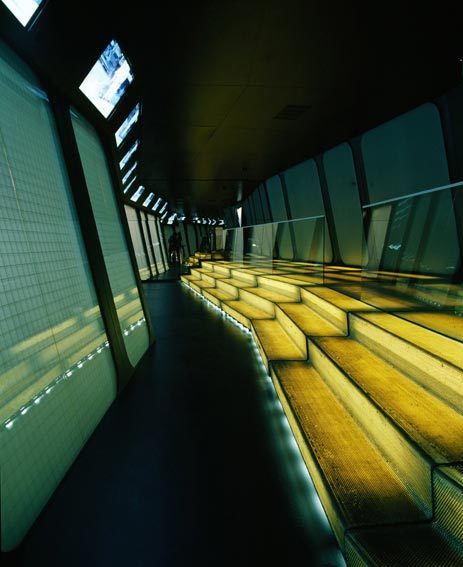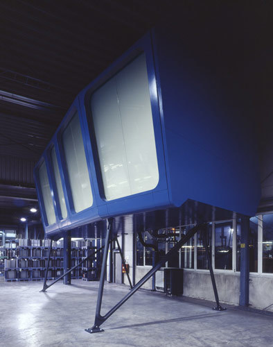 Im Inneren des symmetrisch aufgebauten Stahlmodules wird durch Einsetzen eines (hinterleuchteten) Sitz- und Stehpodestes eine mehrreihige Bespielung des Raumes erreicht; somit wird auch aus den hinteren Reihen der gesamte Ausblick ermöglicht. Nach einem über bündig montierte Flachbildschirme präsentierten Vortrag werden die Glasscheiben von matt auf klarsichtig gestellt und der Besucher erhält unmittelbaren Einblick in die Produktionsabläufe. (Text: Architekten)