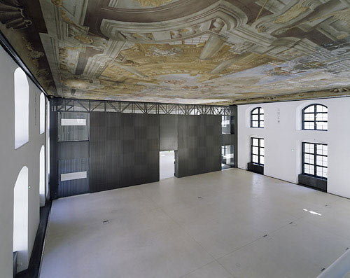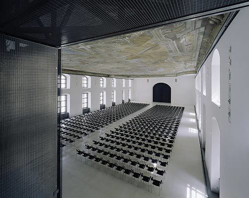 Das siegreiche Wettbewerbsprojekt Prohazkas sah den Vortragssaal unter der breiten Freitreppe im Straßenhof vor. Das knappe Budget ließ das aber nicht zu. Rudolf Prohazka, löste die schwierige Aufgabe laut der bewilligenden Denkmalamtsvertreterin mit einer „Königsidee“. Nun lässt sich im Theatersaal eine 70 Zentimeter starke, über die gesamte Breite und bis knapp unter das Fresko reichende Wand auf zwei seitlichen Zahnstangen mechanisch verschieben. Damit lassen sich unterschiedlich große Vortrags- und Veranstaltungsräume unterteilen. Die Wand ist raumakustisch wirksam und enthält hinter einem Chromstahlgewebe Scheinwerfer und weitere Ausrüstung. Selbst die Übersetzerkabinen lassen sich darin integrieren. Damit wurde in der 350 Jahre alten Baustruktur sehr viel modernste Technik untergebracht. Diese und auch das komplett neu errichtete Stiegenhaus samt Aufzug an der Stirnseite zum Platz vor der Jesuitenkirche sind in einer zurückhaltenden zeitgenössischen Formensprache ausgeführt, die mit dem rationalen Bestand harmoniert, weil beide strukturell verwandt sind.