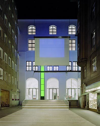 Zur visuellen Kommunikation mit dem urbanen Umfeld sind drei bis zum zweiten Stock reichende, schmale Plasmadisplays bündig in die Fassade eingelassen. Sie wirken in die Bäckerstraße, zur Postgasse sowie in die Riemergasse hinein und lassen sich mit beliebigen Inhalten bespielen. Ein frei vor der Südfassade aufziehbarer Screen dient als Projektionsfläche. Damit erhält das ruhig und unaufdringlich wirkende Haus ein markantes Signal zur Stadt, ohne dass die historische Substanz angetastet wird.