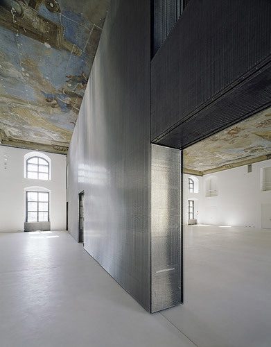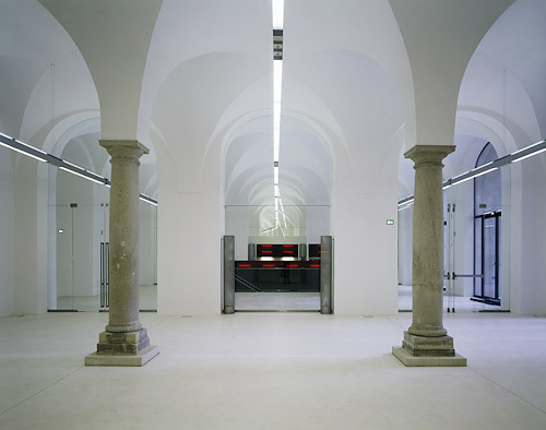 Im Geschoß darüber entfallen die Säulen. Die Korbbogentonnen überspannen locker zehn Meter, Stichkappen verbinden quer dazu. Hier und in der Aula sind die Räume für Ausstellungszwecke vorbereitet. Dem rationalen Tragsystem ist ein Versorgungsnetz überlagert, das Energieträger sowie Anschlüsse für Informationstechnologie über Bodensteckdosen und Lichtschienen so weit verteilt, dass für künftige, wechselnde Ausstellungsverhältnisse vorgesorgt ist.