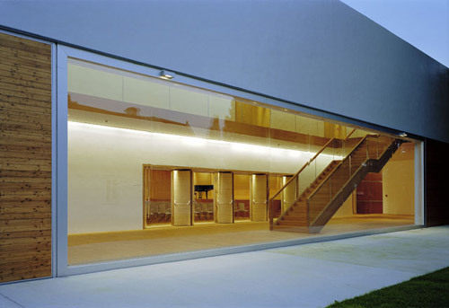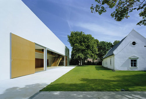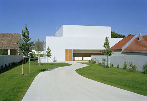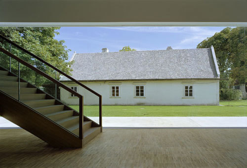 Das Konzerthaus ist umschlossen von weißen Wänden und hat - genau wie die Bauernhäuser der Umgebung - allein Fenster im Erdgeschoss. Der wesentliche Unterschied zu ihnen liegt nicht im proportionalen Aufbau, sondern in seinen absoluten Dimensionen. Das neue Haus erhält dadurch etwas Erhabenes und setzt sich - bei aller Anlehnung - durch eine schlichte, aber noble Monumentalität ab.