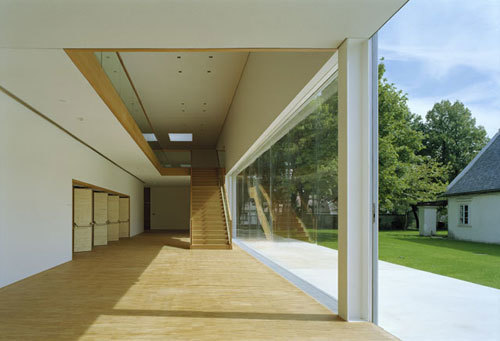 Eine wichtige Rolle spielt dabei die öffentliche Foyerzone des Hauses. Diese ist als ein kontinuierlicher Raumzusammenhang gestaltet und umschliesst als zweigeschossiger Bau die höhere, eigentliche Konzerthalle. Dieser Raum wird im Inneren wesentlich bestimmt durch weisse Wände und einen hölzernen Fussboden. Zum Park hin öffnet er sich nach allen Seiten mit 18 m bzw. 13 m langen und 4 m hohen Fenstern, die symmetrisch die Fassade gliedern. Diese Fenster wurden, um störende Einteilungen zu vermeiden, nicht als konventionelle Glasverbundfassade sondern aus monolithischen Acrylscheiben realisiert. Die Scheiben wurden aus einem Stück in der Fabrik gefertigt und vor Ort montiert und poliert. Durch diese enormen Verglasungen entsteht eine intensive Beziehung zwischen dem Park und dem Inneren des Hauses. Vom Foyer aus wird die Wahrnehmung der Landschaft extrem intensiviert - sie erscheint als Panorama und wird in ihre Erscheinung durch den hermetischen Charakter der Fenster noch gesteigert. Das Franz Liszt Geburtshaus wird auf einem Graspodium an die Besucher präsentiert und erscheint dabei wie eine Ikone. Von Aussen artikulieren sich die Fenster nicht als Wanddurchbrüche, sondern erscheinen als kraftvolle, straffe Objekte innerhalb der Wand, die den umgebenden Park reflektieren.