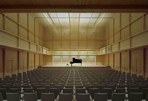Das Leimbinderraster wird mit Dreischichtplatten aus Fichtenholz ausgefacht. Um die gewünschte starke Resonanz zu erzielen, sind diese Platten mit eine Gewicht von bis zu 350 kg pro Stück (40 kg/m2) außergewöhnlich schwer. Um Flatterecho zwischen den Wänden zu vermeiden und eine möglichst diffuse Verteilung des Tones im Raum zu erzeugen, wurden die Platten dreidimensional zur Mitte hin gekrümmt. Dies wurde möglich durch den Einsatz einer CNC-Fräse, wobei allein die Oberschicht der Dreischichtplatte bearbeitet wurde. Die Platte variiert in ihrer Dicke zwischen 12 cm in der Mitte und 8 cm am Rand. Der Fussboden des Saales wurde als Doppelboden realisiert und ist – wie das Foyer - mit Eichenparkett versehen. Der entstehende Zwischenraum innerhalb des Fussbodes wird als Plenum für die Belüftung des Raumes mit Quelluft benutzt. Die Absaugung der Luft erfolgt über Fugen in der Decke. (Gabriele Kaiser nach einem Text der Architekten)