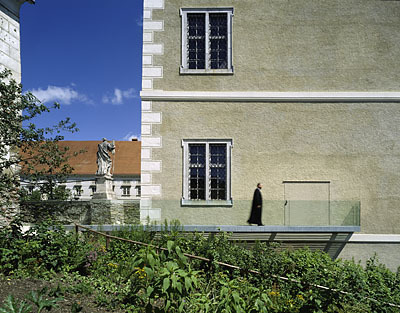 Die meisten der infrastrukturellen Maßnahmen sind in der kostbaren barocken Bausubstanz verborgen oder in diese geschickt integriert. Besondere Eingriffe wie das völlig neue Stiegenhaus, die Sanitäranlagen und die aufwändigen Brandschutzmaßnahmen verstehen sich als eigenständige architektonische Elemente, die inhaltlich auf den Geist und die Tradition des baulichen und künstlerischen Wirkens im Stift zurückgreifen.