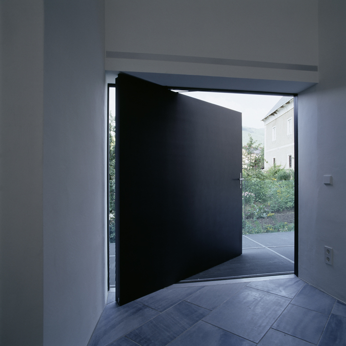Ausgang West: Der Ausgang an der Westfassade des Südtraktes ist nicht nur Fluchtweg für den Seminarbereich, sondern auch eine neu geschaffene Verbindung zwischen dem Südtrakt des Stiftes und den Gästehäusern und Ateliers. Eine quadratische, 210 x 210 cm große Tür, asymmetrisch drehend, führt auf einen Gitterrost-Steg. (Text: Pater Gerwig Romirer, Peter Reitmayr)
