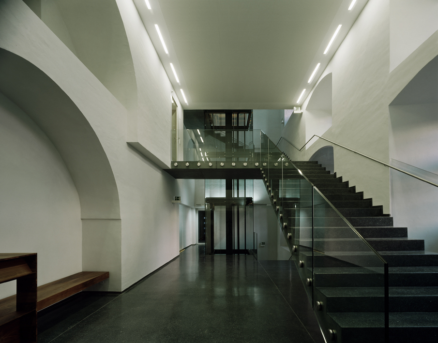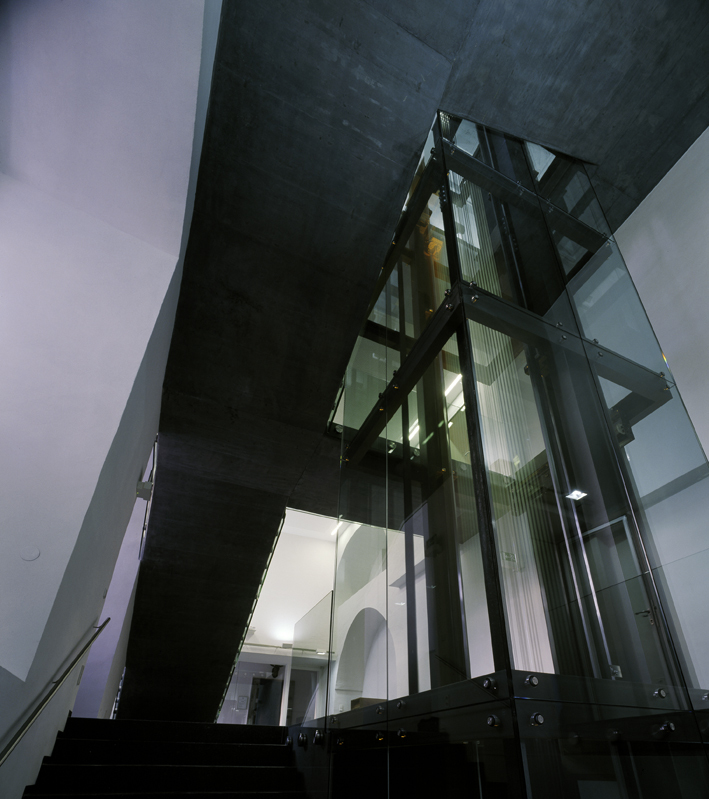 Stiege und Lift: Zur barrierefreien Erschließung des Seminarbereiches der „Schule des Daseins“ und gleichzeitig als sicheres Fluchtstiegenhaus für den Veranstaltungsbereich wurde die Stiegenanlage vom Erdgeschoß zum 2. Geschoß, und der Lift noch ein Geschoß höher bis in den Dachstuhl geführt. Die Stiege ist als monolithische, schwarze Betonskulptur, die Aufzugsanlage mit verglastem Schacht und gläserner Kabine gestaltet.