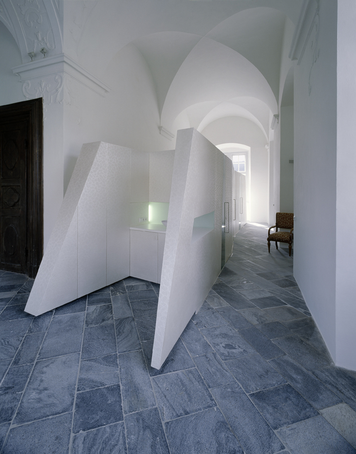 Seminarräume, Meditationsraum: Eine Flucht von Prunkräumen im 2. Geschoß des Südtraktes wurde für Seminar- und Vortragstätigkeit ausgestaltet. Um die spezielle Gestimmtheit der Räume möglichst wenig zu beeinträchtigen, wurde die erforderliche technische Infrastruktur in multifunktionalen Möbeln untergebracht, die geschlossen lederbespannte Kuben, in geöffnetem Zustand aber Waschtisch, Tonanlage und Stauraum sind.