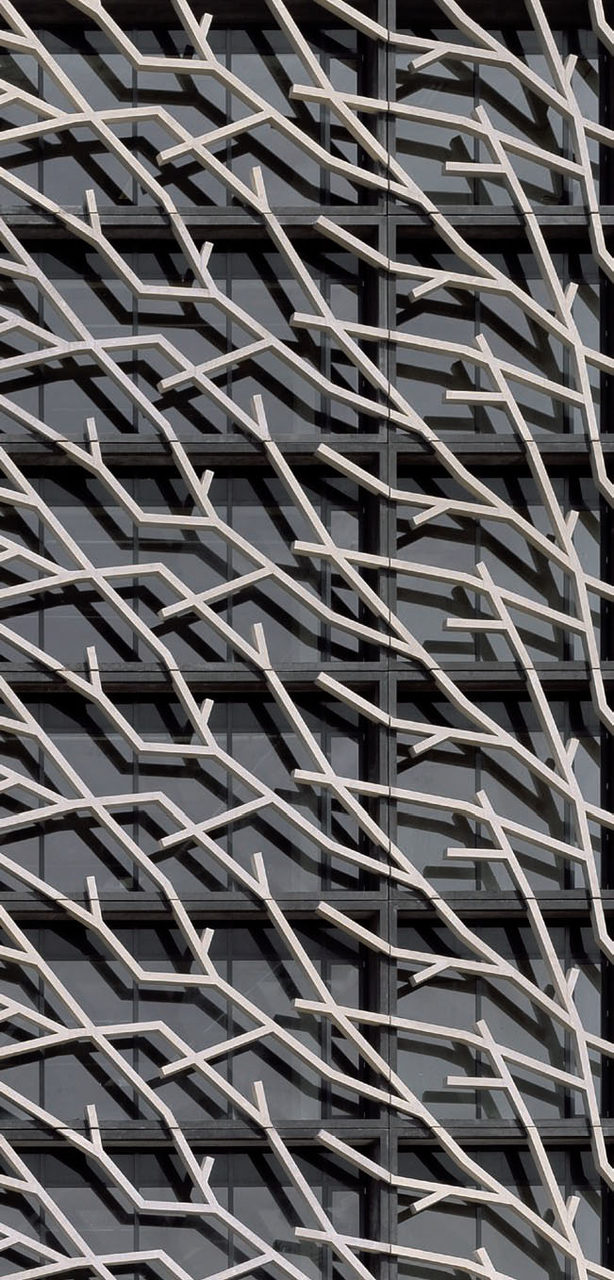 Das auf einem schmalen Grundstück und unter strengen auflagen errichtete Bürogebäude ist auf allen vier Seiten mit einer Aststruktur aus vorgefertigten Betonelementen überzogen. der ornamentale Schleier lässt den Bau klar aus der Häuserzeile heraustreten, obwohl er dabei nur verhältnismäßig leise Töne anschlägt.