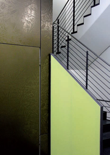 Für die Gestaltung der Oberfläche der Aluminium-Fassadenpaneele haben sich die Architekten nach intensiver Recherche für ein besonderes Verfahren entschieden. Um den Baukörper mit seiner absolut planen Außenhaut noch stärker als visuelle Einheit erscheinen zu lassen, überzieht ein organisch kristallines Muster die geschlossenen Fassadenelemente.