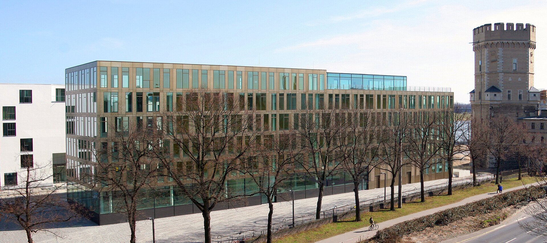 Der Bürobau im Rheinauhafen zelebriert das Prinzip der Einheit in der Vielfalt. Schillernd eloxierte Aluminiumpaneele und transparente Fassadenfelder bilden einen spannungsreichen Kontrast im Wechselspiel aus Licht und feinen Farbnuancen. Die vollflächig eben ausgeführte Fassadenhaut betont die kubische Form des Baukörpers und wird durch ausstellbare Lüftungsklappen spielerisch strukturiert.