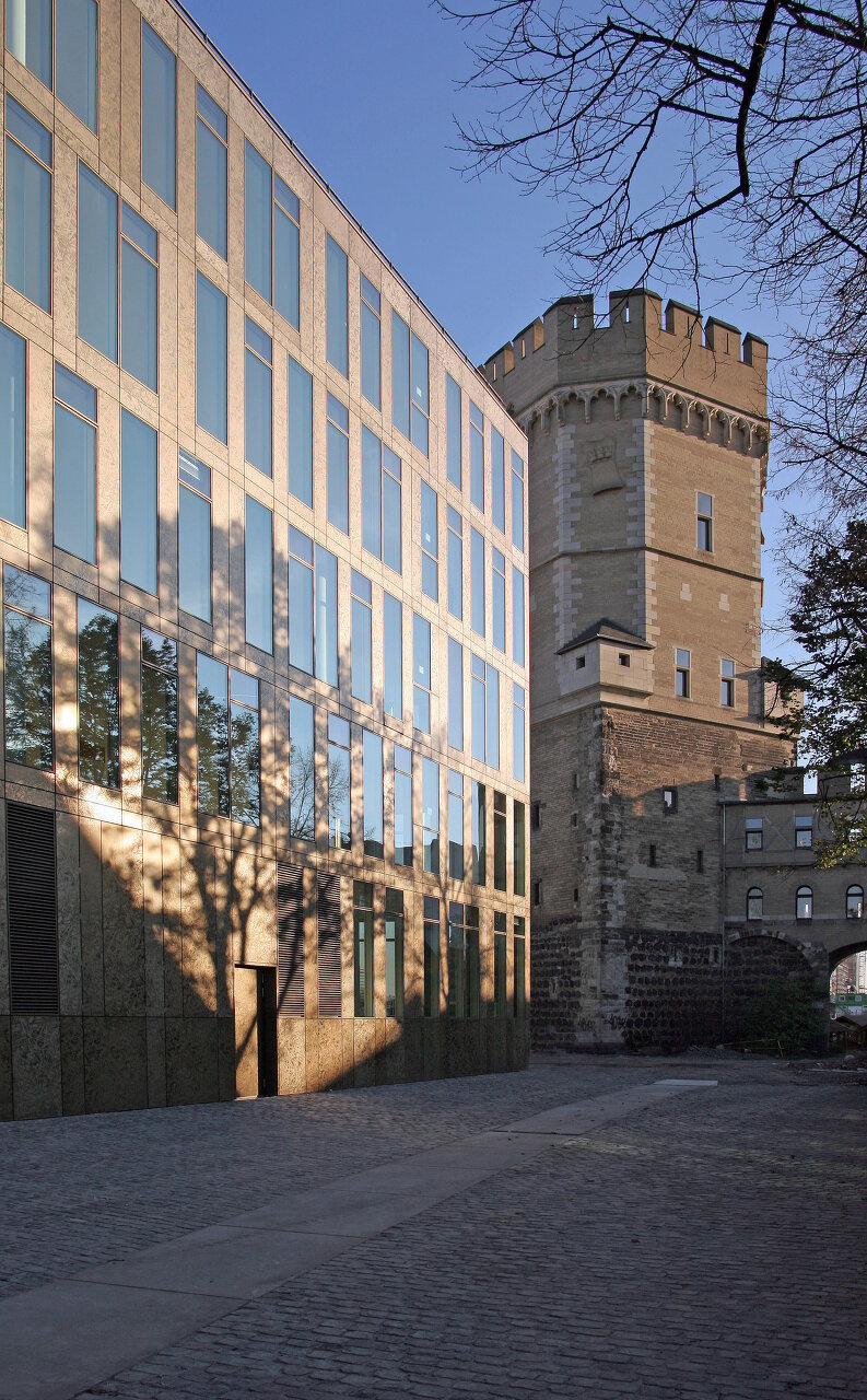 Sowohl die Nutzung als flexibles Mietbüro als auch die vorgegebene Kostengrenze veranlassten die Architekten, eindeutige Präferenzen zu setzen. Der innere Kern wurde auf ein absolutes Mindestmaß reduziert. Wesentliche Aufgaben fallen somit der Gebäudehülle zu: In ihrer visuellen und haptischen Erscheinung muss sie eine hohe ästhetische und dauerhafte Wertigkeit für die zukünftigen Nutzer repräsentieren. Gleichzeitig soll der Neubau sich zwischen den historischen Nachbarn behaupten und vermitteln. Anstatt des im Rahmenplan vorgesehenen umlaufenden Staffelgeschosses konzentrieren die Architekten das Bauvolumen des obersten Geschosses auf der nördlichen Seite. Zum Bayenturm hin nimmt sich der Baukörper deutlich zurück und verbindet so auf unprätentiöse Weise die unterschiedlichen Bauhöhen der historischen Nachbargebäude Hafenamt und Bayenturm entlang der Rheinuferstraße untereinander. Im Erdgeschoss reagiert das strenge kubische Bauvolumen auf den oberen Rücksprung mit einer transparenten Glasfassade.