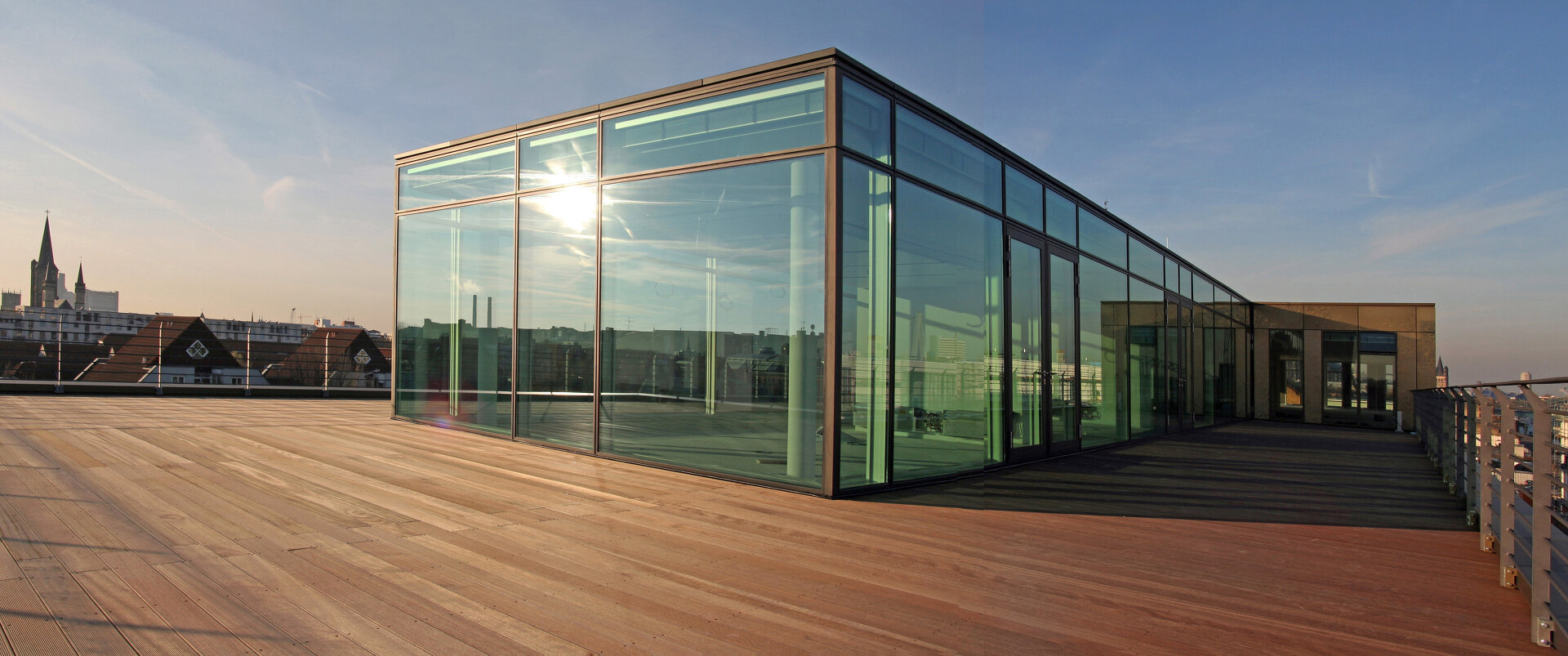 Die Innenseiten der geschlossenen Elemente lassen sich zusätzlich mit Akustikpaneelen oder Kühlelementen bestücken, um so auch erhöhte Komfortansp rüche berücksichtigen zu können. Die vollflächige Glasfassade des zurückgesetzten Dachgeschosses, die ebenfalls auf einen außen liegenden Sonnenschutz verzichtet, beeindruckt durch ihre filigrane, flächenbündige Oberfläche. Hier muss jedoch der Sonneneinstrahlung mit integrierten Kühlelementen entgegengesteuert werden.