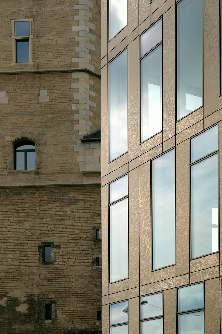 Die gold-messing-farbenen Aluminiumpaneele und die grüntürkisen Glasscheiben erinnern an die rheinische Variante der Nachkriegsmoderne mit ihren verspielten Oberflächen und edel gefassten Messingprofilen und interpretieren sie neu.
