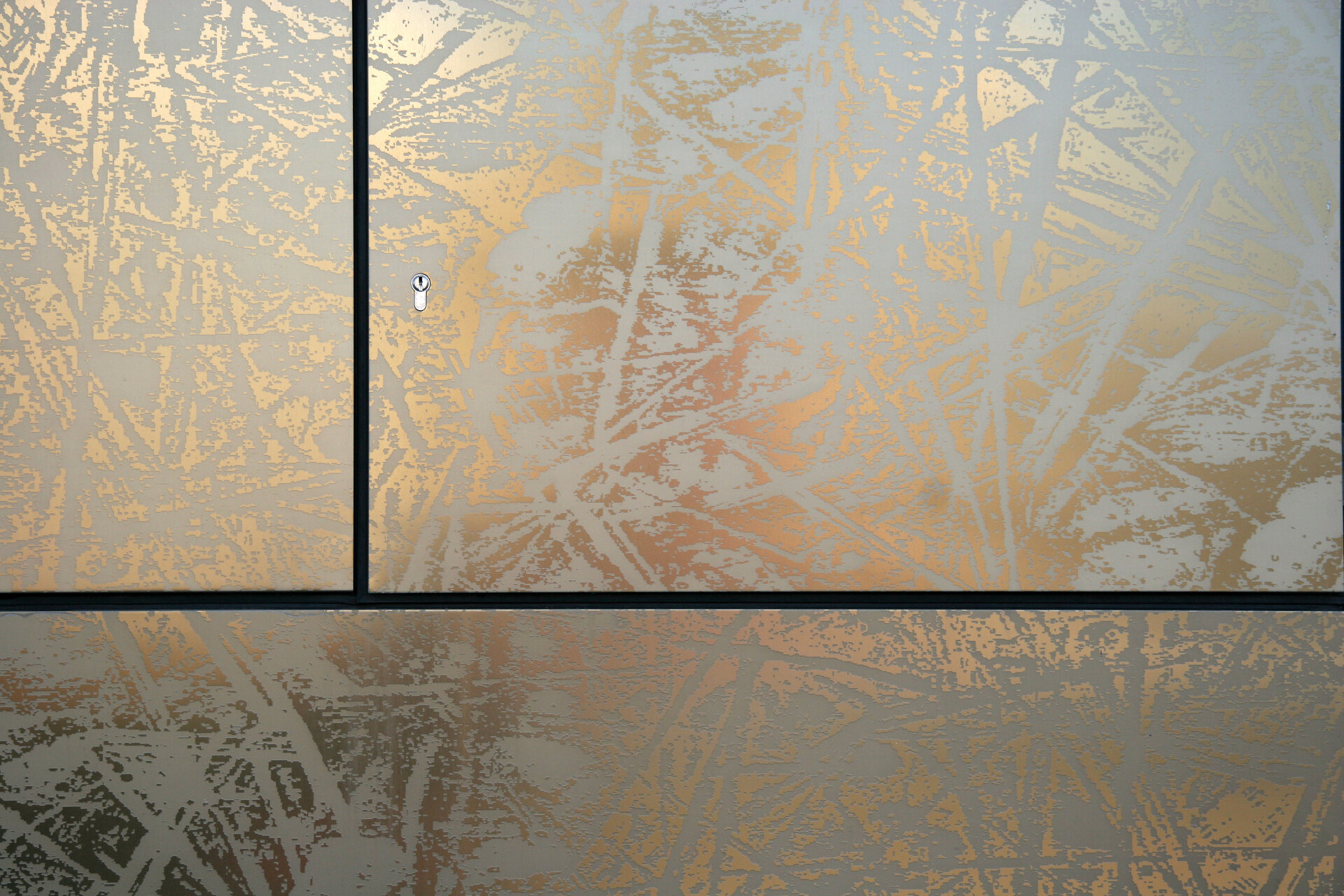 Ein vorgefertigtes, auf Pixeln basierendes Endlosmuster hebt sich mit glänzender Oberfläche vom matten, messingfarbenen Grund ab, so dass sich je nach Lichteinfall eine fast einheitliche Oberfläche ergibt oder das Muster in deutlichem Kontrast hervortritt. Erreicht wird diese Struktur durch eine leicht erhabene und eine weniger starke Materialschicht, die jeweils in unterschiedlichen Farbtönen bzw. Oberflächen (matt/glanz-) eloxiert ist. Dass dieses patentierte Verfahren derzeit nur von einer spezialisierten Firma in Neuseeland angewandt werden kann, hat die Bauherren trotz höherer Kosten und der Risiken der Lieferfristen nicht abgeschreckt. Die visuelle Wirkung der eigens angefertigten Musterfassade ließ die Bedenken in den Hintergrund treten.
