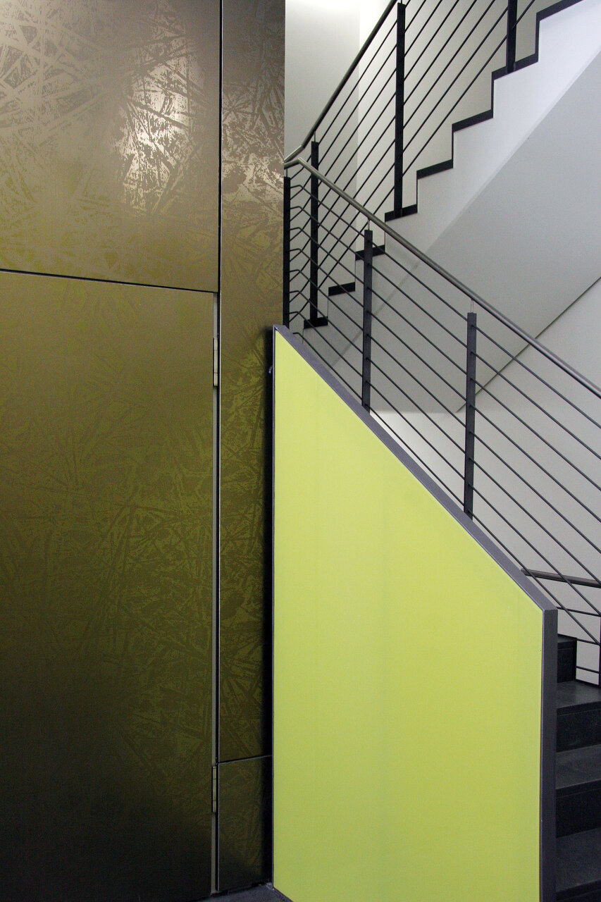 Durch den Verzicht auf außen liegende Verschattungselemente wird eine absolut flächenbündige Fassade mit extrem schmalem Fugenbild möglich. Die Minimierung der Paneel- und Elementfugen auf nur 15 mm Breite und den unregelmäßigen Wechsel von offenen und geschlossenen vertikalen Elementen lässt eine lebendige, vibrierende Oberfläche entstehen. Durch die hohe Präzision und Bündigkeit verschmelzen die Elemente aus eloxierten Alupaneelen und Glasflächen zu einem objekthaften, solitären Körper aus einem Guss.