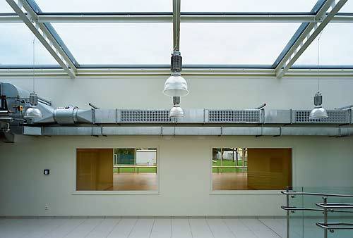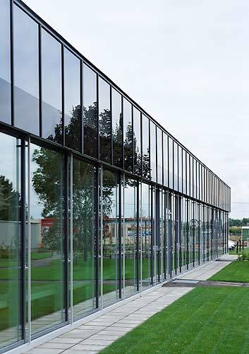 Von außen präsentiert sich das Gebäude als sehr ruhiger, niedriger Baukörper, der ins grüne Umfeld sensibel eingebettet ist. Vom Hof her ist dem Körper gewissermaßen ein Eck ausgeschnitten – wodurch der Hof zum geschlossenen Rechteck und der Eingang deutlich sichtbar wird. An der Nordseite, die dem Schulhaus zugewandt ist, liegen alle Verwaltungs- und Nebenräume. Hier ist die Fassade verhältnismäßig geschlossen, es gibt Oberlichtbänder (also indirektes Sonnenlicht, ohnehin die bessere Lösung für Arbeitsplätze). Die an sich völlig unspektakuläre, voll verglaste Südfassade ist trotzdem interessant, denn durch die über der Raumverglasung liegenden, dunkleren Solarpaneele wird die Horizontale des Gebäudes noch einmal betont. Obendrein verwandelt der außen liegende Sonnenschutz das Ganze – je nachdem – in eine offene oder geschlossene Schatulle.