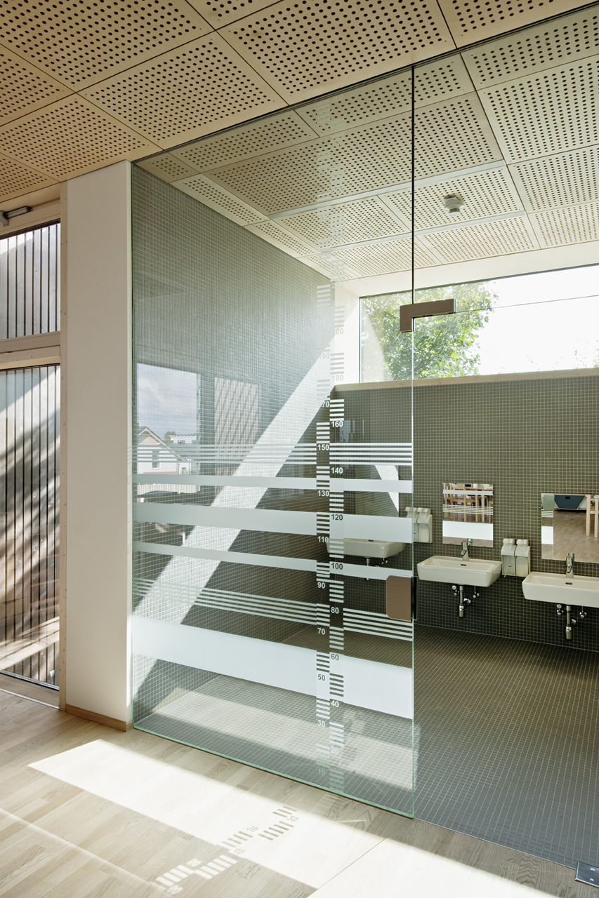 Dreh- und Angelpunkt ist ein großes, hohes, glasüberdachtes Atrium, das als Aufenthalts- und Verteilerhalle fungiert. Die Gruppenräume – sie sind alle nach Süden orientiert – werden über die Garderoben erschlossen, die vom Atrium bis an den südlichen Freiraum reichen. Diese Garderoben sind übrigens besonders gut gelungen, weil sie Räume sind – und nicht bloß Gänge, flankiert von Spinden. Sie sind breit, und durch die raumhohe Verglasung schauen sie ins Grüne. Da zeigt sich auch, dass es von Vorteil ist, wenn der Architekt zumindest die fixen Wandeinbauten selbst entwerfen kann, das bringt einen deutlichen gestalterischen, atmosphärischen Gewinn.