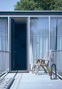 Die geschlossenen Seiten der Wohnboxen sind mit einer 30 Zentimeter starken Wärmedämmung versehen, die zu den Rändern hin allerdings auf die Hälfte reduziert wurde. Dies verleiht den Fassaden eine Filigranität, die den leichten Gesamteindruck der „schwebenden Kiste“ auch bei näherer Betrachtung erhält. Auf außenliegenden Sonnenschutz wurde aus ästhetischen Gründen verzichtet. Die erste sommerliche Bewährungsprobe haben die neuen Schlossherren dennoch gut überstanden, verfügt das Haus doch neben einem klimatisch günstigen Gründach in seiner luftigen Höhe auch über eine optimale natürliche Durchlüftung.