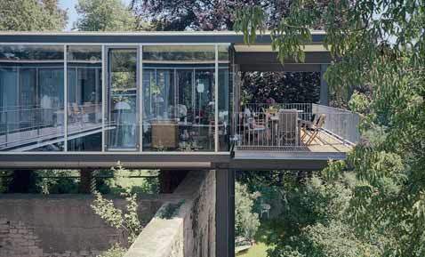 Schon ein Jahr nach der ersten Präsentation konnten die beiden Generationen Krohmer ihre spiegelsymmetrisch konzipierten Häuser beziehen, die mit Baukosten von 1200 Euro pro Quadratmeter Wohnfläche den gegebenen finanziellen Rahmen exakt eingehalten haben. Die zwei orthogonalen Wohnboxen stehen in sechs Meter Höhe über der Ruine, zu der sie einen respektvollen Abstand wahren, um diese statisch – und optisch – nicht zu belasten. Getragen werden sie von je vier Stahlprofil-Stützen, die außerhalb der alten Mauern platziert sind, so dass der Raum darunter frei disponierbar bleibt. Er wird im Rahmen von Ausstellungen und Veranstaltungen der Öffentlichkeit regelmäßig zugänglich gemacht.