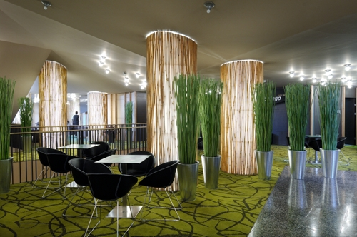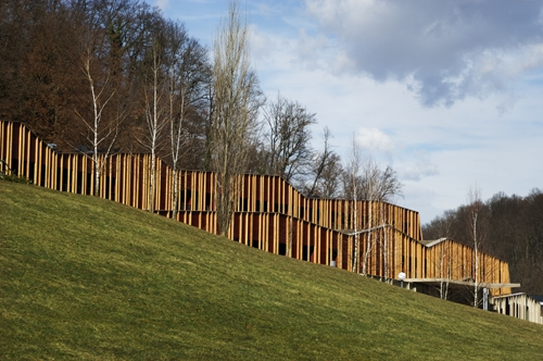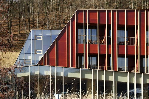 The recently opened Hotel Sotelia in Podčetrtek is a part of a larger complex of thermal bath facilities, situated on the East of Slovenia on the very border with Croatia. The hotel is situated on the edge of a forest and is the last of several hotels, each built in a different time and in a different architectural style in an natural amphitheatre around the central hot water pools. With its „organic“ form the Sotelia hotel tries to merge with the surrounding landscape but is never the less the most remarkable. The designers - a young architectural team of Dean Lah and Milan Tomac, owners of the Enota Architectural Office from Ljubljana, had to face several contradict requests. On one hand the economy of a hotel demands for a larger scale: more rooms, larger restaurants, and more guests… On the other hand contemporary guests requires the contrary – he would like to feel individual approach, he would like to be alone with personal treatment. Solving this problem the architects tried to divide the programme on several units thus making the impression of a smaller scale. In fact the hotel is divided in two parallel tracts with rooms, using the advantage of a position on a slope. The first row is only one side oriented and contains bigger apartments, while the second row contains normal rooms double oriented towards the valley as well towards the forest. The design is very clever as the second tract overlooks the first row of rooms and the atrium between both tracts is used for massage treatment demanding intimacy. The adaptation of the landscape resulted in breaking the long shape of the building thus diminishing the scale of the façade. The roofs, emerging from nearby meadows are covered with grass thus confusing the feeling where the ground floor actually lies. Looking from a room loggia one has a feeling that his room is on a lower floor, touching the ground. The rooms are marked also on the façade: where there are private rooms the façade is made of wood, while public spaces have a facade made of glass. Vertical wooden columns mark the façade and they correspond well with the trunks of trees in the forest behind, additionally adapting the building to the landscape. These wooden columns are dimensioned so that it is not possible to see from one loggia or balcony to the other. A person leaning out of the balcony can see only a row of wooden columns in perspective. One finds the vertical wooden columns also in front of the glass façade of the public spaces. Here the glass surfaces are printed with floral motifs on the lover part. The motifs are printed on the glass from the outside and with its printed surface diminish the reflection, a phenomenon that with glass facades became already annoying. From the inside, the printed floral motifs close the inner space thus preventing it to „escape“ through the glass façade. The large portico marking the entrance is the only element that steps out from the rest of the façade. Against the usual rules one cannot find the name of the hotel on top of it. The sign with the name is posted on top of the stairs that lead on the platform in front of the hotel. In this way the guests taking photographs, can use the stairs as a stage and film the hotel in the background.Also in the interior the architects had to deal with large capacities of the hotel and need for intimacy. For this reason they developed columns covered with pieces of bamboo wood. These columns are not part of the construction; their only purpose is to divide the space into smaller more intimate spaces. They also have lights, speakers, air condition and other similar facilities incorporated. In addition there are also smaller elements – vases with coloured branches that help creating friendly atmosphere of the interior. Because of the use of wood, the theme of nature is present also in the interior. The bamboo columns are quite huge elements and are more than 100 of them so they can prevail over posters, signs, commercials and other uncontrolled elements that so often appear unexpectedly in such tourist places. Otherwise the interiors are quite simple and effective and one cannot feel the financial limits the architects had to deal with.