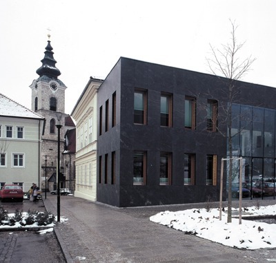 Eine plumpe Aufstockung aus der NS-Zeit wurde entfernt und die alte Dachform wieder hergestellt. Weiters wurde ein Anbau anstelle der Erschließungs- und WC-Anlagen an der Ostseite neu errichtet. Die Architekten Gabriele und Peter Riepl gestalteten den Zubau in Form einer glatten, kompakten Scheibe als Kontrast zum reich dekorierten, cremefarbenen Bestand. Die Fassade ist mit fünf Zentimeter starken Platten in den Formaten 215 mal 100 cm und 120 mal 100 cm in einem fünf Millimeter feinen, offenen Fugenraster verkleidet. Der schwarzgrau-olivfarbene Stein, dessen sichtbare Oberflächen fein geschliffen wurde und in der Sonne schimmernd glänzt, erinnert an dunklen Marmor. Dieser Naturstein wurde auch als Bodenbelag in den öffentlich zugänglichen Bereichen eingesetzt. Einzig die in Lärchenholz ausgeführten Fensterläden nehmen Bezug auf die ländliche Umgebung.