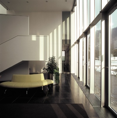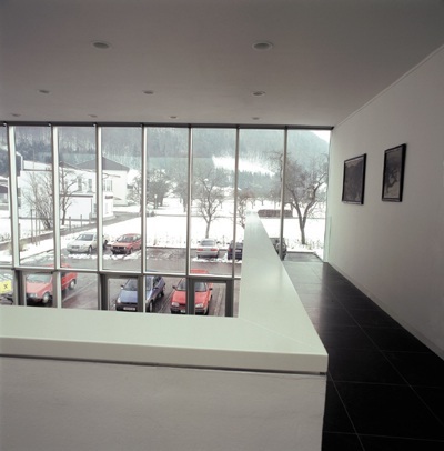 Man gelangt durch den Bestand in die neue, zweigeschossige Halle und von dort über die frei positionierte Treppe in das Obergeschoss, wo sich der Gemeindesaal und das Standesamt befinden. Von hier aus eröffnet die grossflächige Verglasung der Fassade den beeindruckenden Blick in die Landschaft. (27.08.2001)