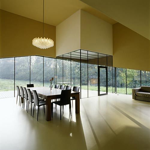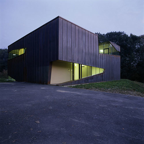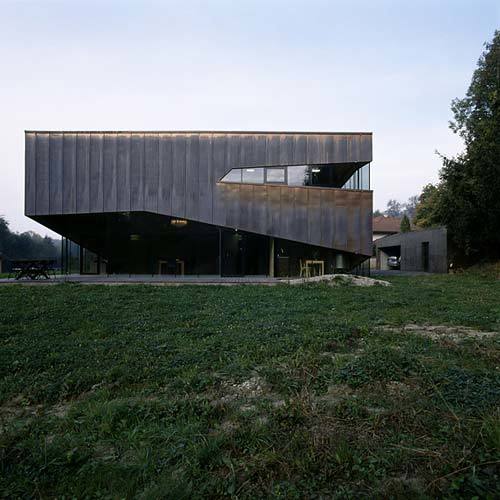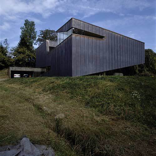 Man thront auf einem Geländeplateau über Wald, Wiese und Schwimmteich. Wie eine verschlossene Auster steht das Haus über einem quadratischen Grundriss von fünfzehn Meter Länge. Rundum ist es von einer Kupferhaut umwickelt, in die polygonale Öffnungen geschnitten sind, die in einer raffinierten Choreografie Weg und Raumstimmung inszenieren. Sukzessive weitet sich der Blick durchs Fenster, bis die Landschaft im 3D-Cinemaskop-Format endlich das honiggelb fließende Innenleben des Wohnzimmers durchdringt.