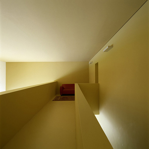 Mit bauplastischer Verve bewältigt Hertl die Stärken und Tücken des Grundstücks. Oben schenkt ein Innenatrium den Eltern viel Licht und eine Terrasse, ein Glaseck erhellt das honiggelbe Gästezimmer mit honiggelbem Bad, die Bibliothek dahinter ist in honiggelbe Farbe getaucht. Nur durch einen Glaszwickel am Boden fällt der Blick aufs Gras.