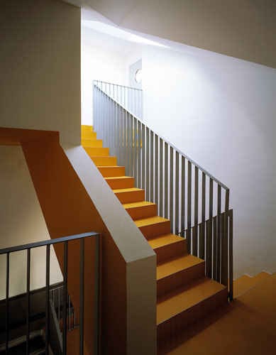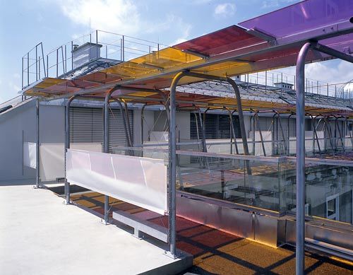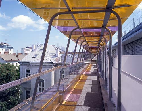 Auf Grund der denkmalpflegerischen Vorgaben waren nur geringe bauliche Eingriffe möglich, die dennoch große Wirkung zeigen. Die Struktur des historischen Gebäudes blieb weitgehend bestehen. Durch Beibehaltung des Neigungswinkels des Daches und die Verwendung von vertieft eingebauten Dachflächenfenstern sind die neuen Interventionen strassenseitig kaum zu merken. Hofseitig wurde der nicht mehr nutzbare flachste Teil der Dachschräge abgetragen und zu Terrassenflächen umgewidmet. Die Freiflächen wurden quasi aus räumlichen Abfallprodukten gewonnen. Den neuen Terrassen vorgelagert und im Niveau etwas niedriger, führt ein dreiseitig umlaufender Laubengang, von dem aus die Appartments erschlossen werden. An dieser Stelle befindet sich auch das buchstäbliche Highlight des Gebäudes: Ein erfrischend buntes Glasdach deckt den neuen Laubengang und krönt das historische Gemäuer mit einer majestätischen Attika. Seine rot, gelb und violett getönten Glasscheiben zaubern bei Sonneneinfall schimmernd buntes Licht auf die Gang- und Terrassenflächen und auf die weißen Segeltücher, die als Sichtschutz zwischen Terrassen und Laubengang dienen. Die hier Vorbeigehenden werden zur unkomplizierten Kommunikation ermuntert, der Gang wird zu einem angenehmen Ort der Begegnung. Entwurfsziel war hier die „Inszenierung eines Weges“, den man bis zu seiner Wohnung beschreitet. „Man betritt eine neue Zone, das Glasdach wirkt bis hinunter in den Hof.“ (Gekürzter Text: Marion Kuzmany, 07.11.2006 für die Immobilienbeilage der Zeitung „Österreich“)