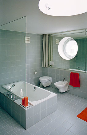 Die Räume des anthrazitfarbenen Zubaus werden großteils durch frei in den Flächen der Außenwände sitzende Rundfenster belichtet und erhalten eine Innendämmung. Die Sanitärräume des als Zweitwohnsitz genutzten Gebäudes können somit rasch erwärmt werden.