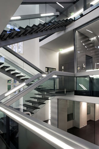 Toll ist der Hauptraum, der jetzt das ganze Gebäude aufschließt. 20 Meter hoch, mit einer Freitreppe, für die sich die Geiswinklers eine spezielle Handlauf-Lösung haben einfallen lassen, lichtdurchflutet (Oberlichten), großzügig, freundlich und offen. Es ist geradezu rührend, wenn man sieht, wie die Leute, die hier arbeiten, mit dieser Architektur umgehen: Sie ziehen die Schuhe aus.
