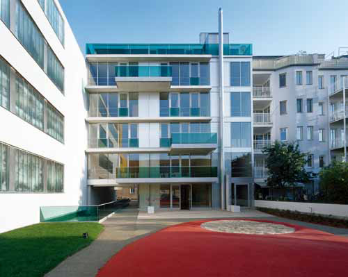 Aus den oberen Stockwerken betrachtet verschwindet die dritte Dimension der Kautschukberge, übrig bleibt ein färbiger Teppich aus amorphen Formen. Unweigerlich muss man an Miró denken. Unweigerlich wird auch klar, weshalb Alexander Runser und Christa Prantl statt eines 08/15-Balkongeländers zum coolen, grünen Glas gegriffen haben. Nicht alle Kinder im SOS-Kidnerdorf sind weit über einen Meter groß. Hätte man die Balkone mit Gitterstäben eingefasst, würden die Kleinsten unter den Kleinen jahrelang das Bild schwedischer Gardinen vor Augen haben.