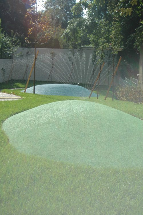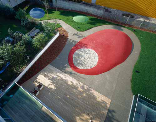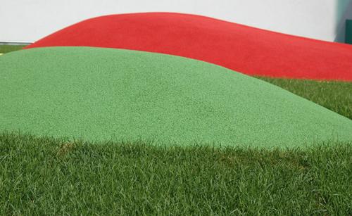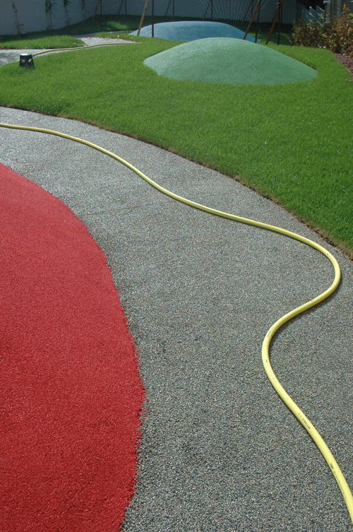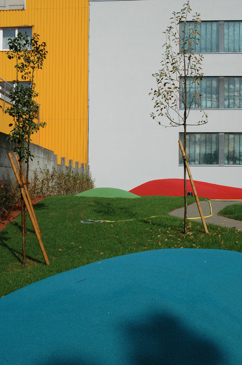 Es beginnt im Hof. Schaukelgerüste aus Holz, Rutschen und Kraxelbäume wird man hier nicht finden. „Am Anfang wollte die Leitung des SOS-Kinderdorfes herkömmliche Spielgeräte von der Stange in den Hof stellen“, so Runser, „gemeinsam mit dem Landschaftsplaner Jakob Fina haben wir nun eine reduzierte Lösung gefunden.“ Und die lautet: Statt den Kindern die Form des Spielens aufzuzwingen, hat man mittels gummiweichen Kautschukgranulats kleine Hügel und Mulden geformt. Einmal tennisplatzrot, einmal blau, einmal türkis. Die Hügel sind grenzenloser Ort für Fantasie, die Mulde indes fasst jenen Sand, der in der Regel in ein rechteckiges Kisterl aus Spielplatzholz gequetscht ist.