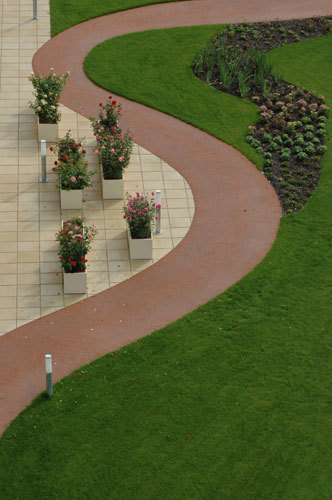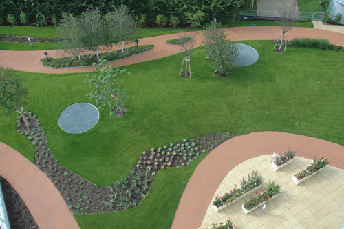 Peichl & Partner haben das Haus so einfach wie möglich angelegt. Der Straßentrakt erstreckt sich über 80 Meter Länge, dahinter gliedern zwei Höfe die in die Tiefe des Bauplatzes ausgreifenden Bauteile. Der erste Hof ist oval, durch ein sattes Rot (eine Referenz Richtung japanische Flagge) gekennzeichnet. Der zweite Hof ist gelb. Und die Bodenfläche wurde nach therapeutischen Vorgaben gestaltet: Es gibt sehr unterschiedliche Oberflächen, auch eine kleine Treppe, die man hinauf- und hinuntersteigen kann. Dieses Thema wird im Garten an der Rückseite des Hauses noch einmal und in größerem Umfang umgesetzt: Da gibt es dann einen Parcours, dem unterschiedliche Erlebnisbereiche zugeordnet sind - vom duftenden Rosengarten über Wasser und Seerosen bis zu einem Pavillon, einem Grillplatz, im kommenden Frühjahr auch einem Kirschgarten.