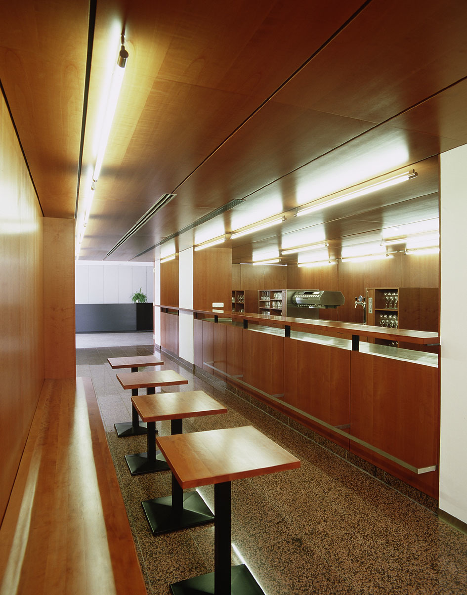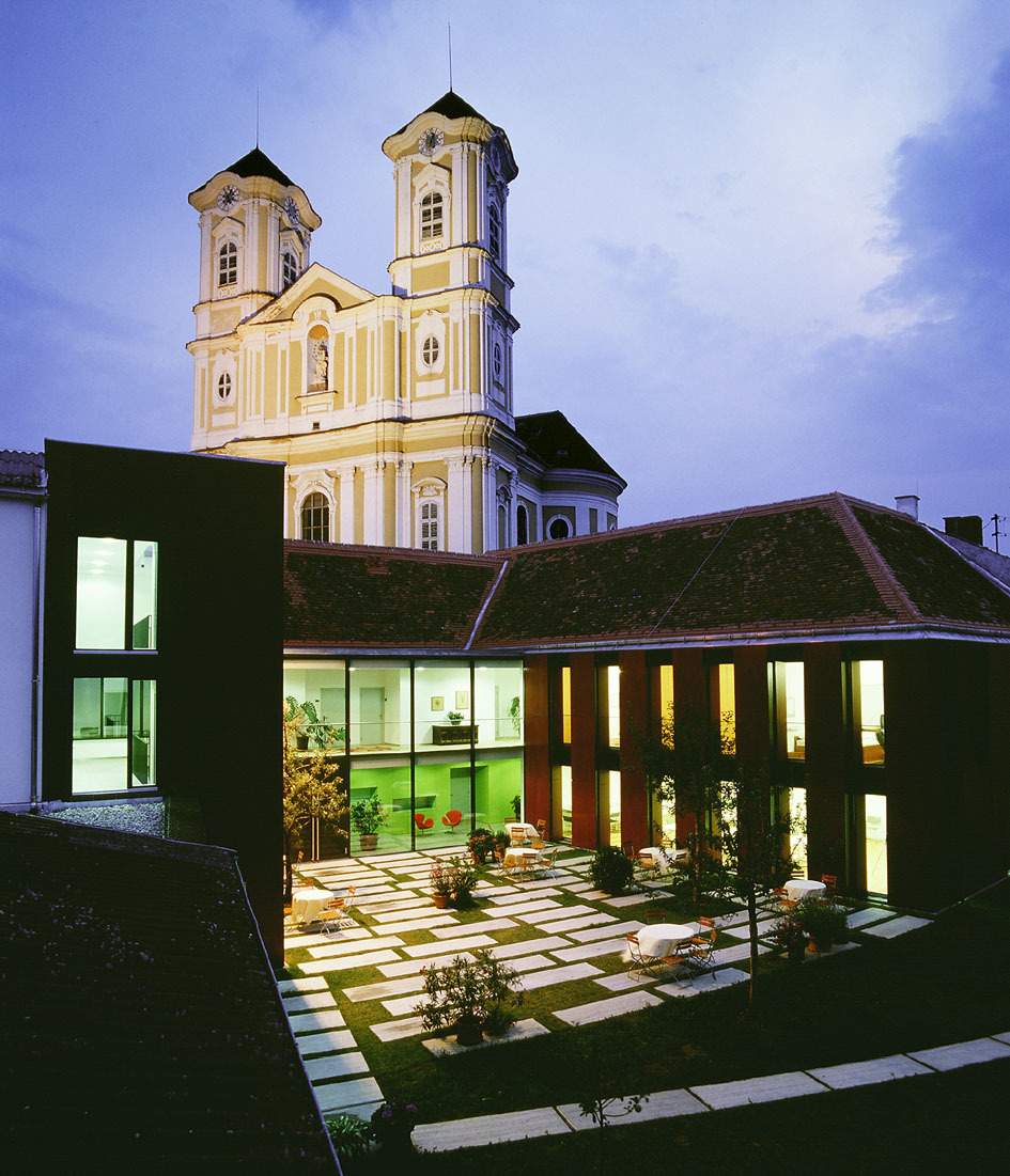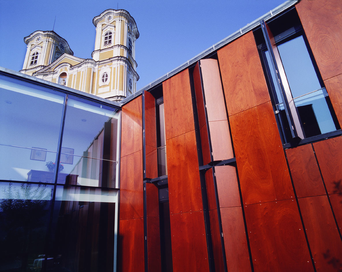 Die Fassade zum dreiseitig umschlossenen Gartenhof vermittelt mittels schmaler, raumhoher Fensteröffnungen mit bündig schließenden Faltläden aus Okoume-Sperrholz einen intimen, warmen Charakter und lässt ein sich immer veränderndes Bild ins Innere der Seminarräume dringen.