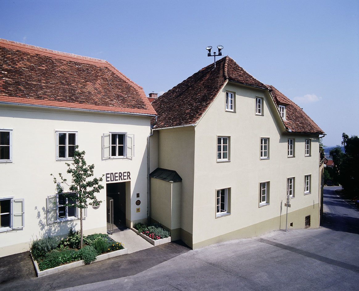 Fünf parallele Schichten können sowohl als organisatorische Struktur gelesen werden als auch als Zonen der Transformation vom Ortskern zur Landschaft, von öffentlich zu familiär und von alt zu neu. Die äußerste Schicht nimmt die Gasträume auf, die mittlere ist als organisatorisches Zentrum mit Küche, Bar und Schank bewusst offen und durchlässig gehalten, um den Hotelbetrieb erleben zu können, der Hotelbereich bildet die innerste Schicht. Dazwischen spannen sich zwei Erschließungsachsen auf, die sogennannte Green Lounge sowie das Foyer, wobei ersterer besondere Bedeutung zukommt.