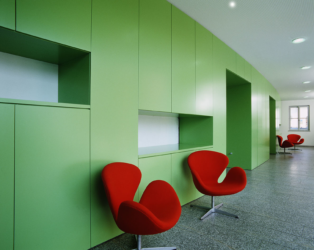 Die Green Lounge, ein leicht gekrümmter 30 m langer Raum, setzt einen selbstbewussten Akzent zwischen Bestehendem und Neuem mit symbolischer Bedeutung als Verbindung der über lange Zeit getrennten Grundstücke. Mit seiner apfelgrünen Farbgestaltung und der Transparenz zu Eingang und Gartenhof wird der Raum zum markanten Orientierungselement. Die leichte Krümmung dient dazu, Unebenheiten der alten barocken Gebäude auszugleichen.