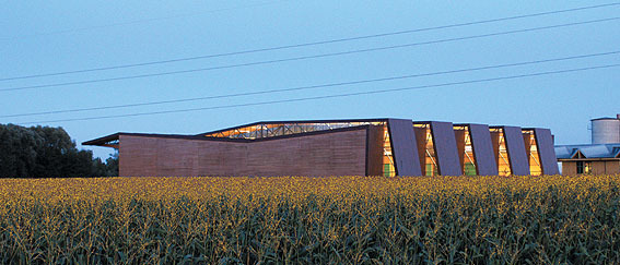ArchitekturBei der Konzeption und Errichtung der Halle werden die zwei Schwerpunkte, ein optimales Arbeitsumfeld sowie ein sichtbares Zeichen für die Philosophie und das Know-how des Unternehmens thematisiert.