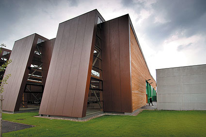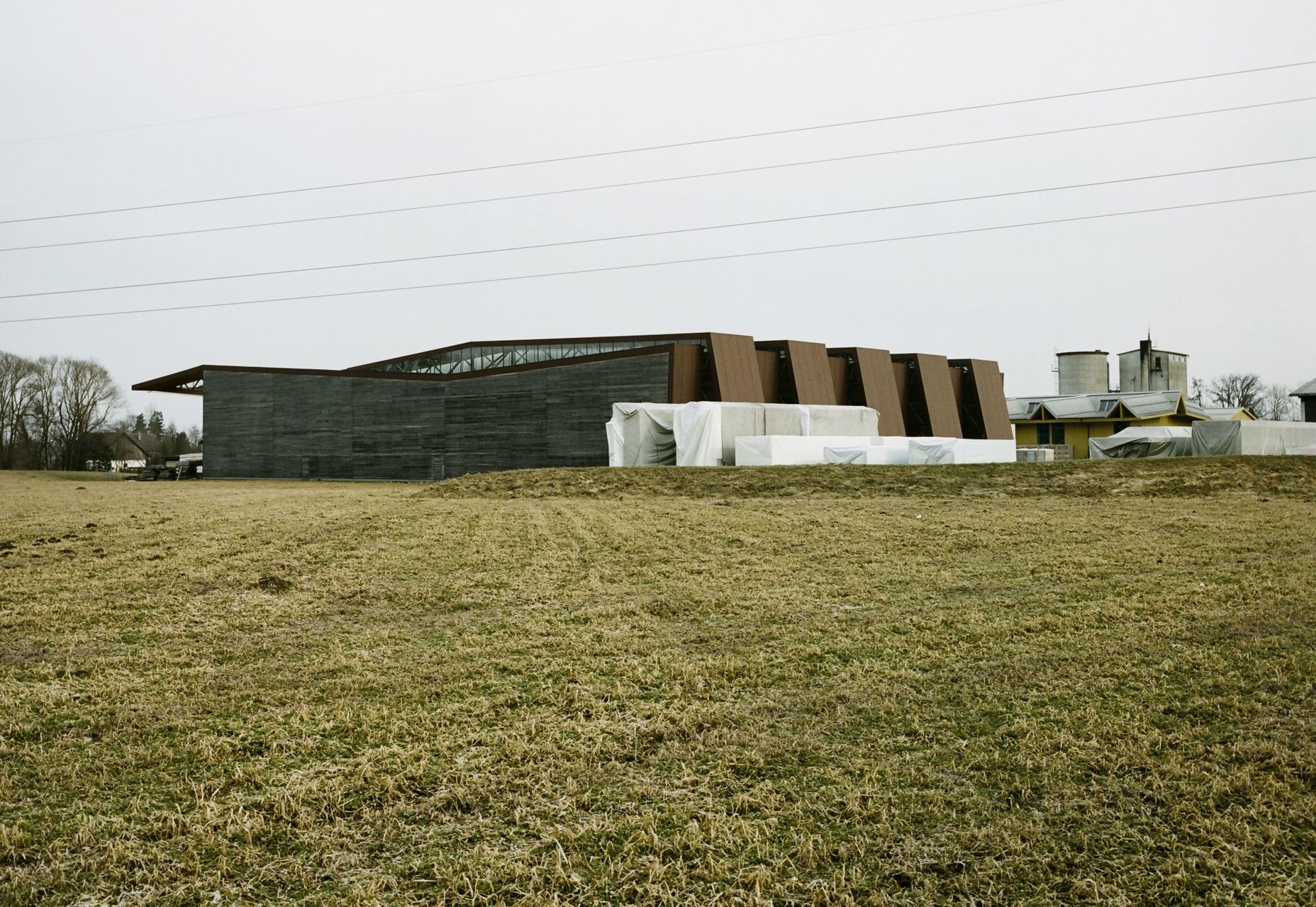 Die Materialisierung der Halle in Form von unbehandelter Lärchenschalung und braun lasierten Dreischichtplatten (Faltwerk) spiegelt den Unternehmensinhalt wider – Holz. So symbolisiert das Gebäude ein Stück geschnittenes Holz mit seiner dunklen, zerklüfteten Rinde und der vergrauten Schnittkanten.