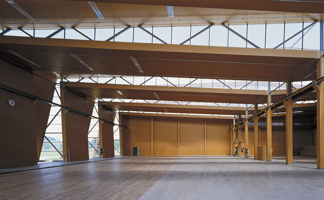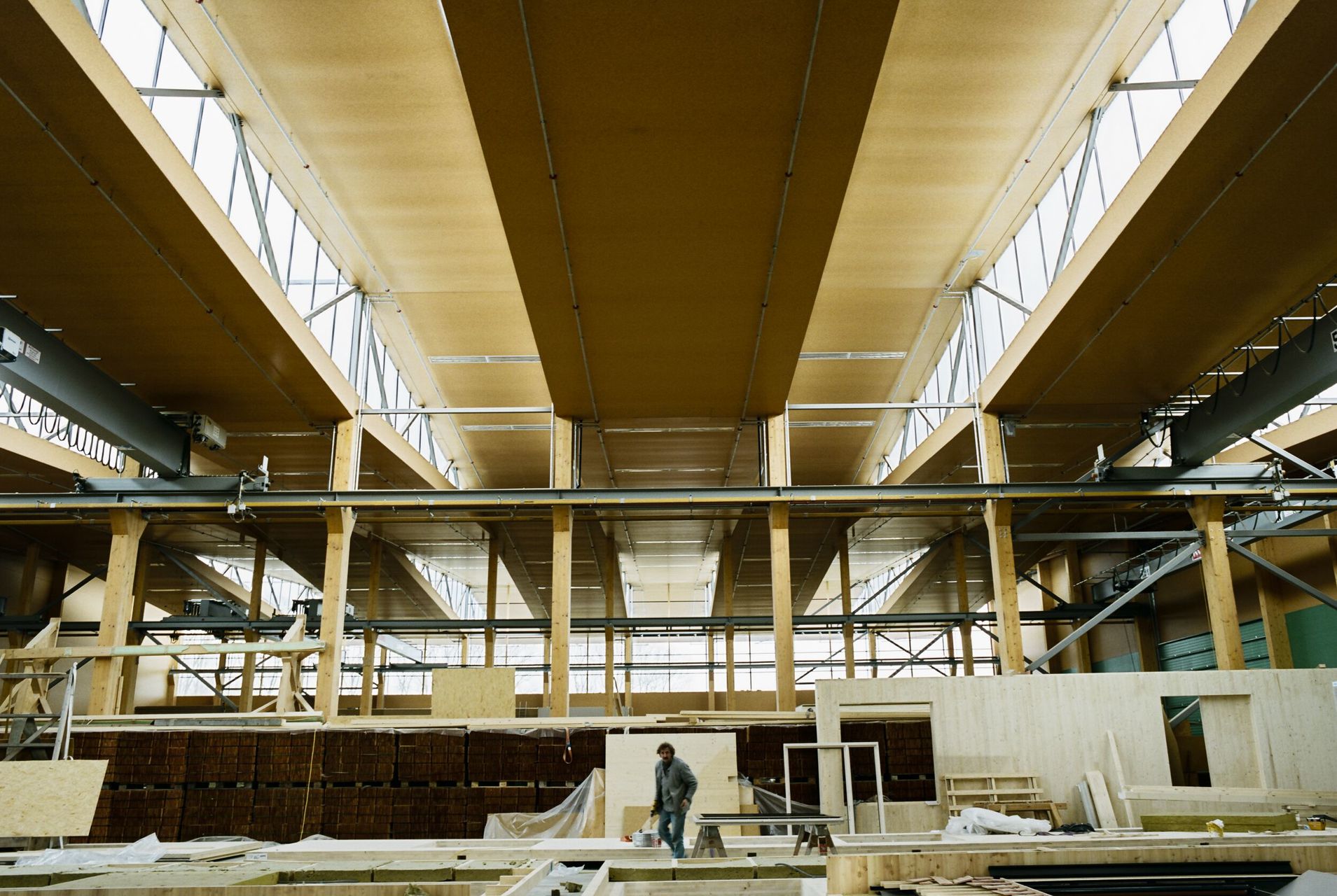 Von der westseitigen Aussenwand beginnend überspannen elf zueinander verschränkte Platten die Halle in Längsrichtung und enden in einem 18 m frei auskragenden Vordach. Dazwischen ruhen sie auf zwei innenliegenden Stützenreihen und auf der Ostwand. Um der Statik genüge zu tun (27 m Stützenabstand sowie 18 m Auskragung), sind die Platten an deren Ränder mittels Stahlstreben kraftschlüssig verbunden. Die Platten sind hochwärmegedämmte Holzsandwichelemente mit einer Gesamtkonstruktionsstärke von 44cm. Aufgrund der beidseitigen Beplankung mit Holzwerkstoffplatten (innenseitig Livingboard face, aussenseitig OSB) sind die Elemente in sich so stabil, dass trotz der komplexen zueinander gegenläufigen Dachlandschaft keine zusätzlichen Konstruktionselemente zur horizontalen Aussteifung erforderlich wird, wodurch die klar ersichtliche Struktur des Daches gewahrt wird
