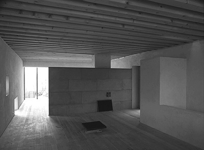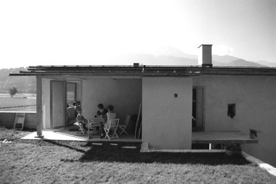Die Südwand ist eher hermetisches Schild gegen die Sonne, Ost- und Westseiten sind analog zu Tal- und Blickachsen geöffnet, beschattete Freiplätze liegen hangseitig, Zimmer mit Loggien ebenerdig und im ersten Stock, durchgehender Wohnraum unter dem Dach. Subtile Staffelung von Volumen und Treppe am aufsteigenden Südhang. (Text: Otto Kapfinger, 21.09.2000)
