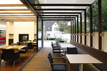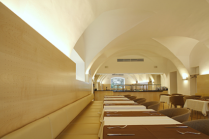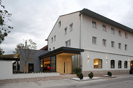 Die neu errichteten Räume bilden aufgrund ihrer Offenheit eine durchlässige Klammer zwischen alter Substanz und Gartenbereich. Eine neue Eingangssituation ermöglicht auch einen vom Beherbergungsbereich unabhängigen Betrieb der Gastronomie.