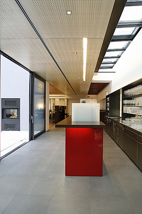 Unterschiedlichste Raumzonen wie Bar, Hochsitzbereich, Kaminzimmer, Gartenlaube und Gewölbezone bieten individuelle Aufenthaltszonen mit wechselnden Ein-, Durch- und Ausblicken, werden jedoch durch die klare reduzierte Formensprache und Materialwahl als einheitliches, gastliches Ambiente wahrgenommen.