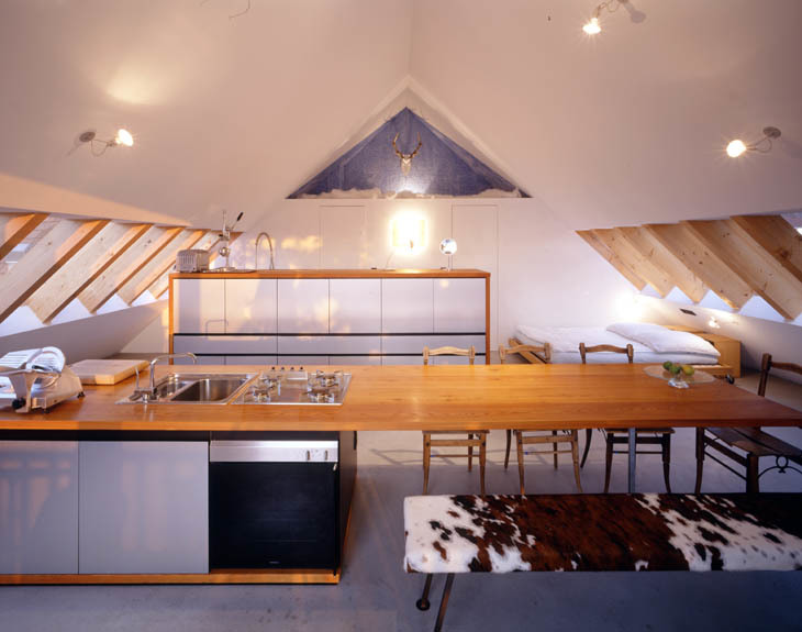 Die Belichtung erfolgt über einfache Dachflächenfenster zwischen der Leimbinderkonstruktion und über hohe schmale Fenstertüren. Ein großes Fenster an der Nord-Westseite erweitert den Raum nach außen zur vorgesetzten Terrasse und der Außentreppe als vertikaler Erschließung. Die oberste Ebene des Neubaus wird als Wohnung genutzt und nimmt das Thema Satteldach konsequent - bis hin zum von der Künstlerin Edith Grabher gestalteten Giebeldreieck „kruzefix“ - auf.