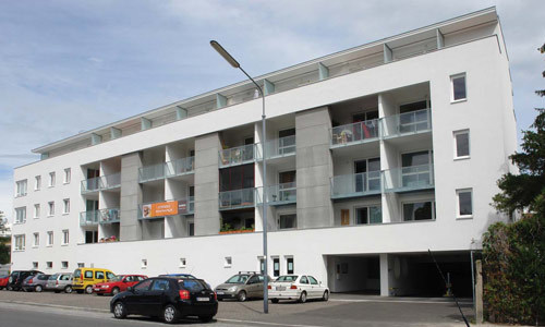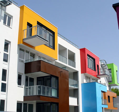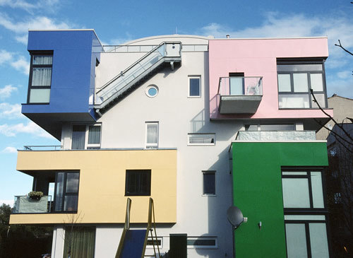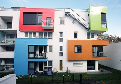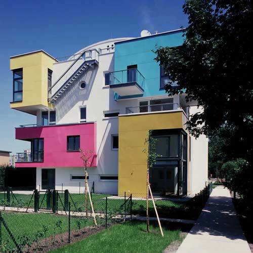 Der Künstler Gerwald Rockenschaub zeichnet für die differenzierende Farbgebung der Erkervorbauten verantwortlich und verstärkt durch seine individuellen Farbkombinationen die oben angeführten Anliegen. Die Wohngebäude sind von großzügigen Mietergärten eingerahmt, die das siedlungsöffentliche Freiraumangebot, das an die zentrale Wegachse räumlich-funktional angelagert ist, ergänzen. Eine Vielzahl an Bäumen bilden quasi das grüne Dach über dem Grundstück. (Text: Architekten)