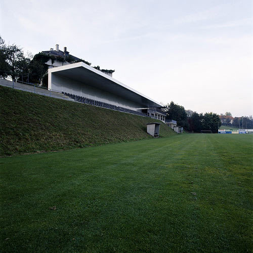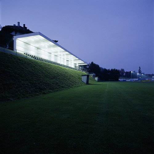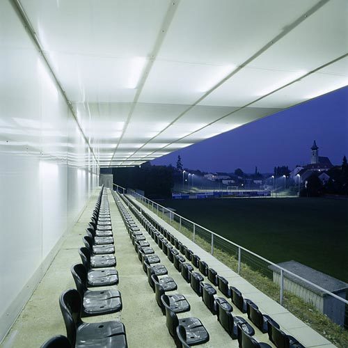 Der 50 cm starke Bügel (Stahlrahmenkonstruktion mit Trpezblechdeckung und Untersicht aus Polycabonatpaneelen) erstrahlt - analog zu einer der Vereinsfarben des lokalen Fußballvereins - in Weiß, wobei vor allem in der Nacht die hinterleuchteten Stegplatten zu nahezu feierlicher Wirkung kommen. Die zweite Vereinslogofarbe, das Schwarz, tritt über die Sitzschalen der Tribüne und vor allem beim schwarz lasierten Betonquader des Kiosk/WCs in Erscheinung. (Text: Gabriele Kaiser)