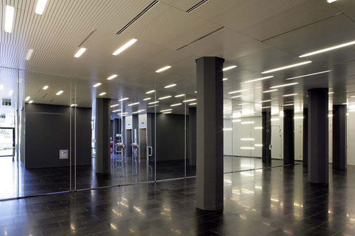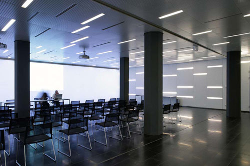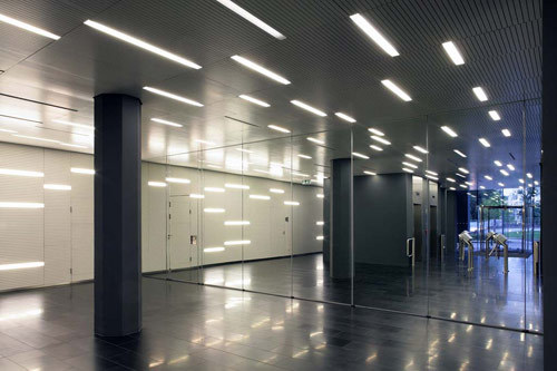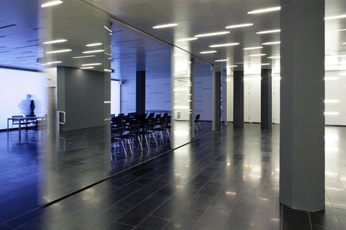 In den Besprechungsräumlichkeiten im 12. Stockwerk und in der Chefetage einen Stock höher geht noch reduzierte zu: Steinplatten und grauer Teppichboden, Glaswände und Edelstahl. An der Decke sorgt grober Spritzputz für gute Akustik, darunter hängen Kühldecken und Lüftungsgeräte herab, Rohre und Kabeltassen werden wie Autobahnen geführt, eine unregelmäßige Matrix aus eigens entworfenen und hergestellten Leuchtstoffröhren erhellt den Raum. Der schlichte Grund für diese karge Offenheit: Eine abgehängte Decke hätte die ohnehin niedrige Raumhöhe gedrückt.